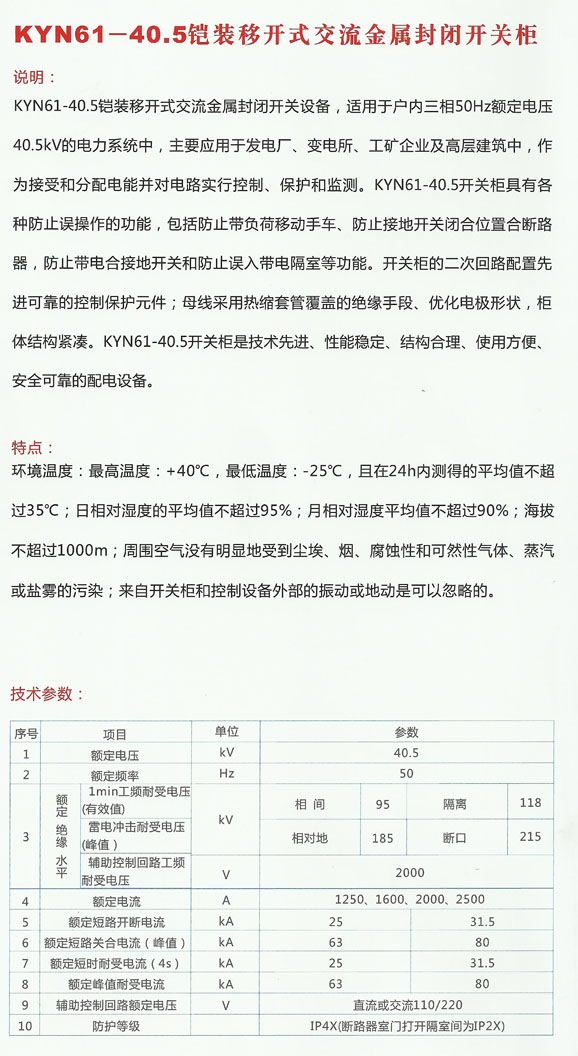 产品名称:KYN61-40.5铠装移开式交流金属封闭开关柜